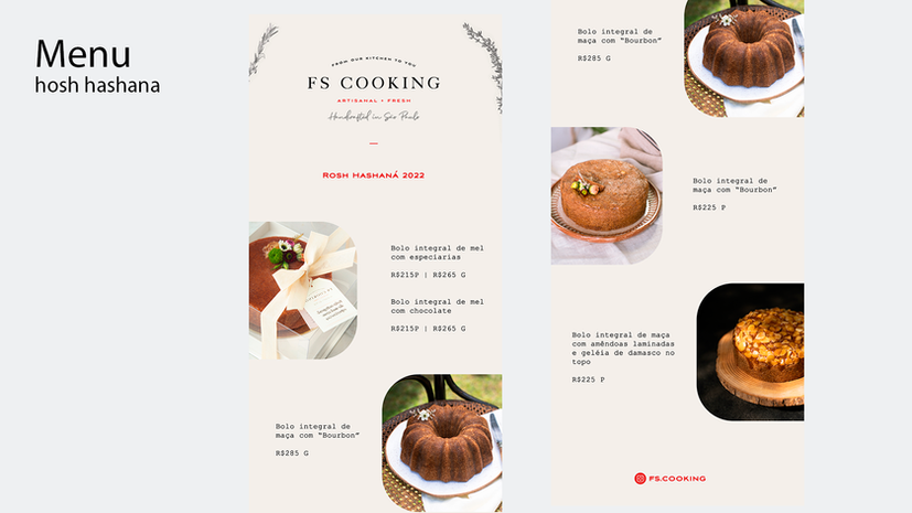 Projeto para FS Cooking realizado durante 2 anos com a marca produzindo conteúdos personalizados para redes sociais, como posts e stories, convites, GIF's, vídeos, tratamentos de imagem, menus e catálogos digitais.